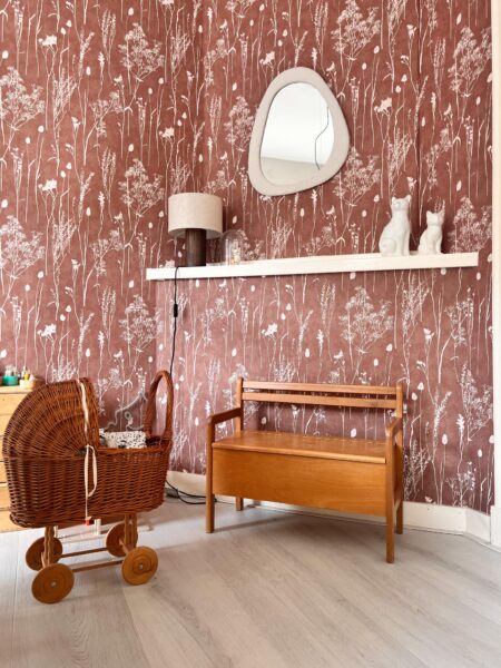 Voor mijn zoontje Moss (ja, die van de gansjeskamer ????) wilde ik een gezellig speelhoekje creëren. En hoe leuk is het dan om daar kringloopvondsten voor te gebruiken! Ik vond een schattig vintage rotan poppenwagentje en een klein vintage klepbankje allebei met zoveel karakter. Het bankje gebruik ik stiekem ook als opbergruimte voor speelgoed Moss heeft er al zijn autootjes in!